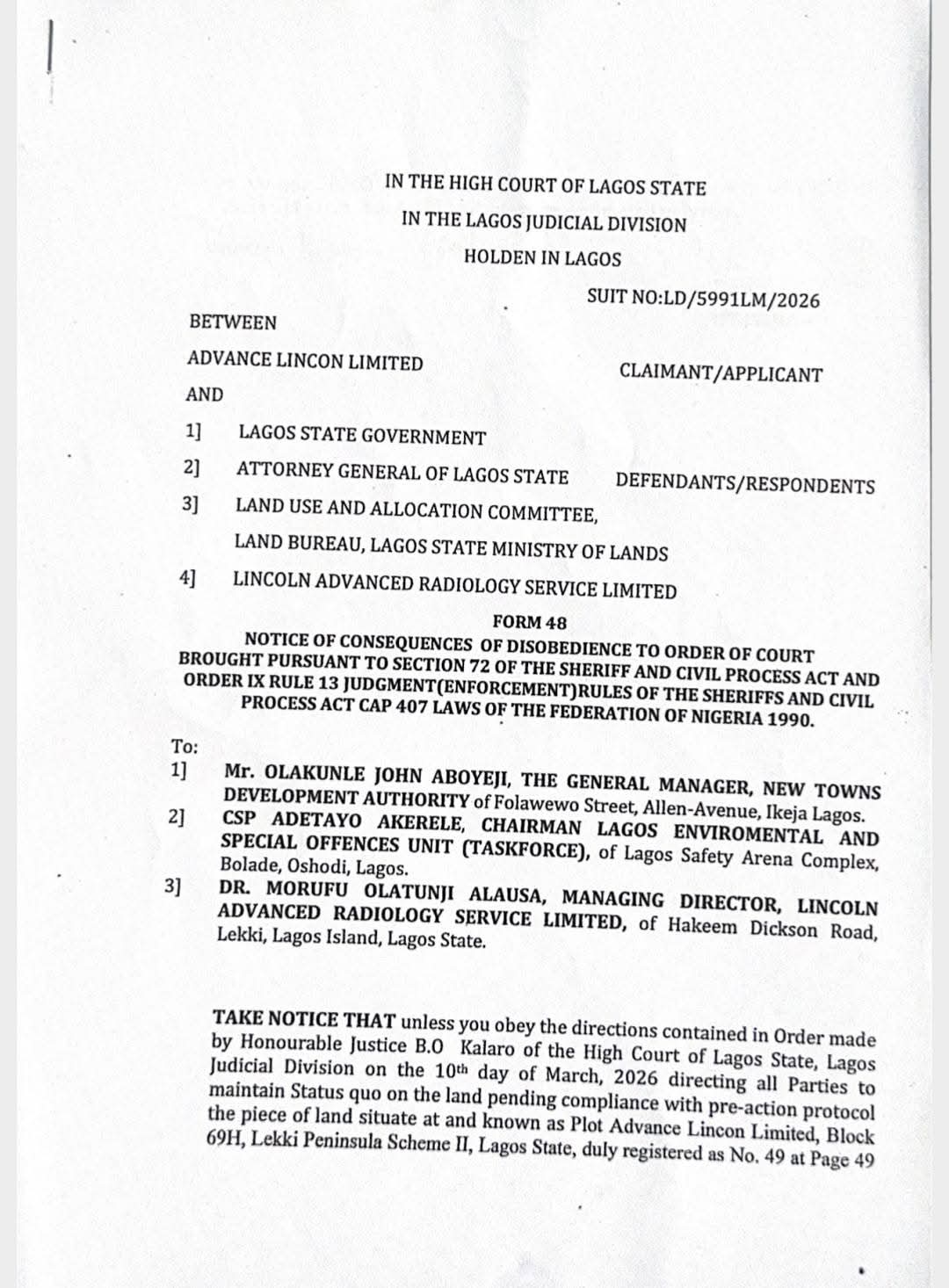 The situation intensified after an order issued by the High Court of Lagos State on March 10, 2026, directed all parties to maintain the status quo pending compliance with pre-action protocols. Legal representatives of Advance Lincon Limited insist that the directive remains valid and binding.