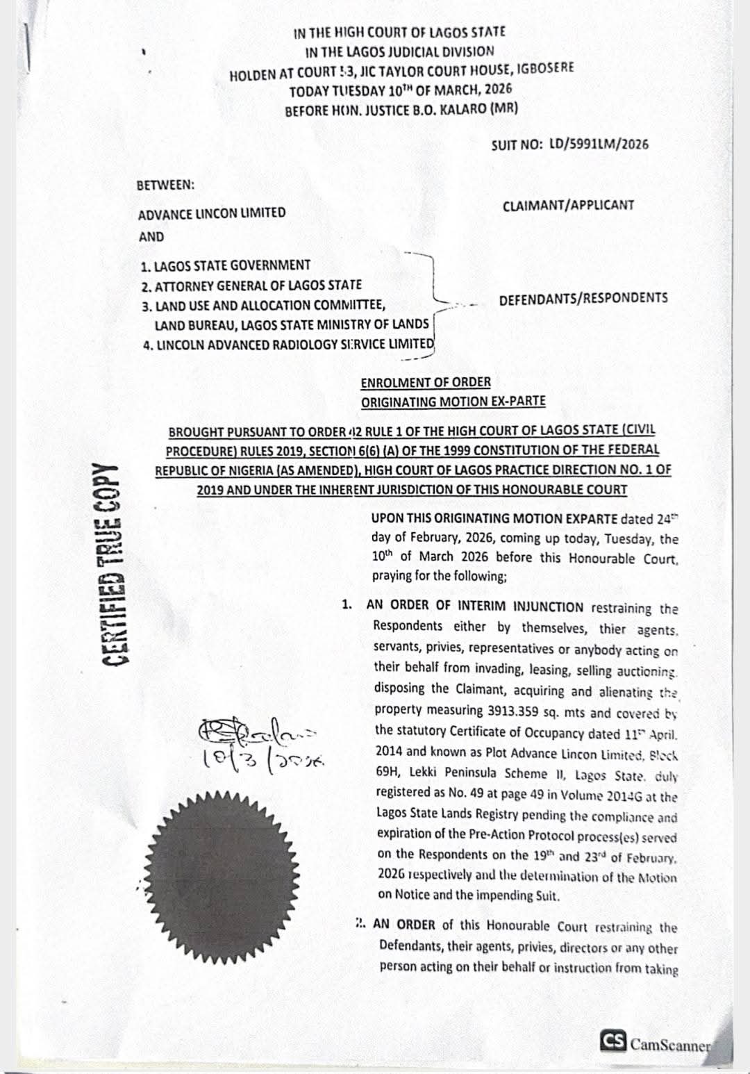 The controversy centres on Plot Block 69H, a parcel of land claimed by Advance Lincon Limited, a company incorporated in 1999. The firm asserts that it lawfully acquired the property through allocations by the Lagos State Government between 2002 and 2009, and later secured a Certificate of Occupancy in 2014 after fulfilling all statutory requirements.
