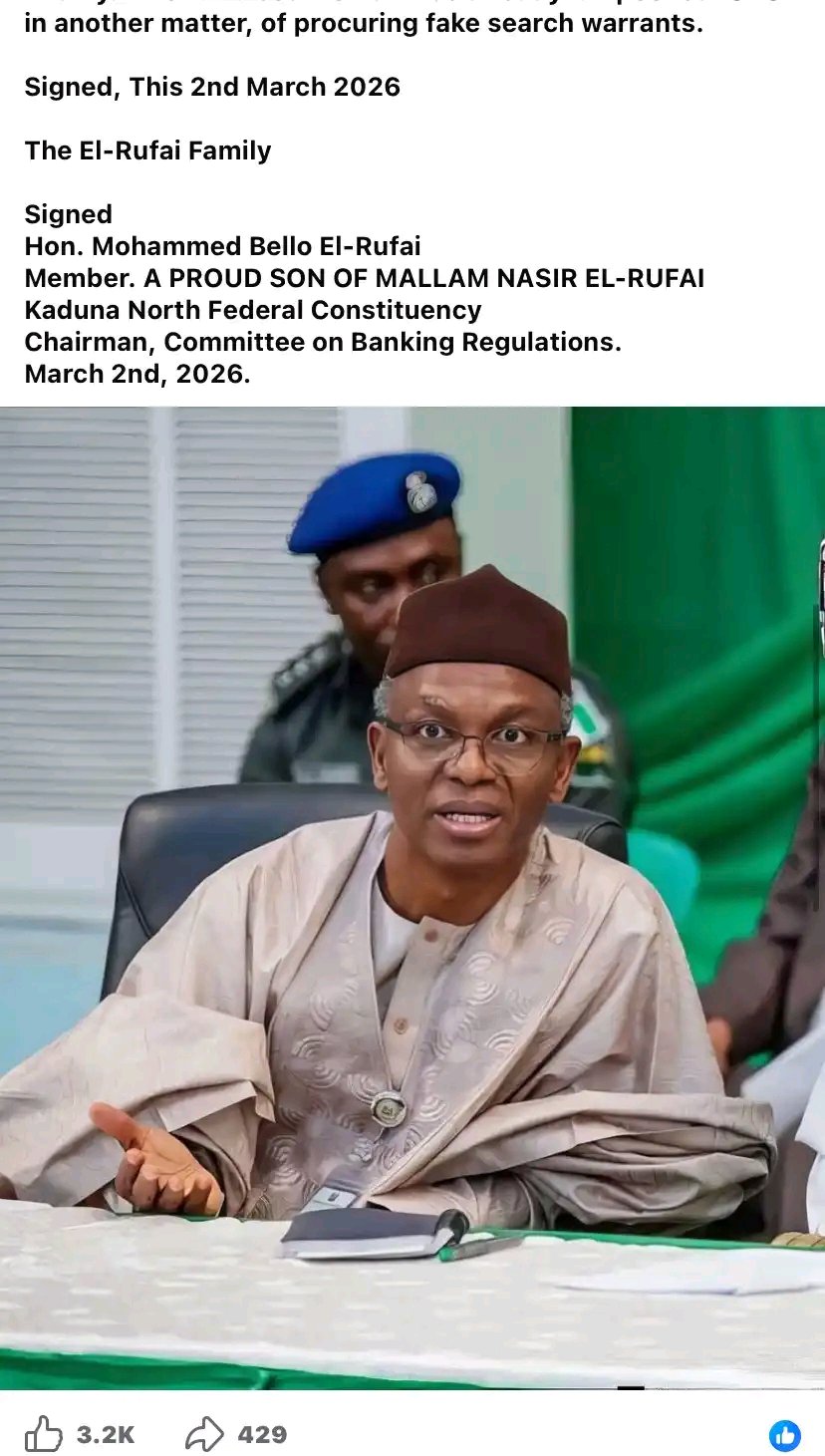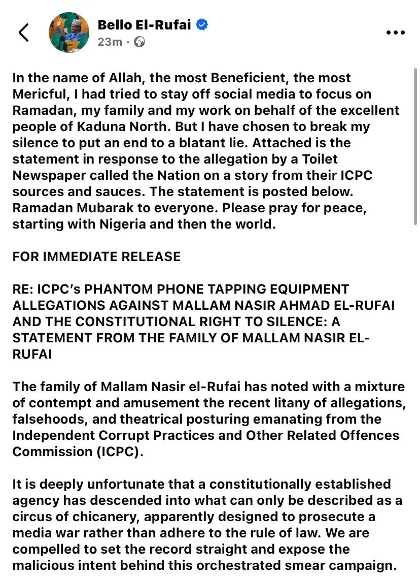 In a statement published on his official Facebook page on Monday, March 2, 2026, Bello El-Rufai said he had stayed away from social media in recent weeks to focus on Ramadan, his family, and his legislative responsibilities. He said he was compelled to respond to what he described as a false allegation reported by The Nation, which he claimed was attributed to sources within the (ICPC).