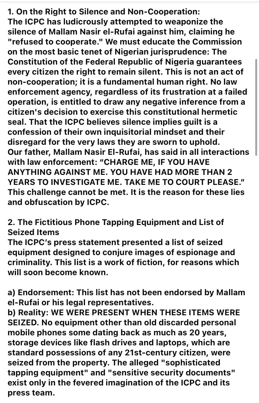 On the issue of equipment allegedly recovered during a search, the family disputed the ICPC’s account, describing the published list of items as inaccurate. According to the statement, family members were present during the search and said that only “old discarded personal mobile phones,” storage devices, and laptops were taken. It maintained that the alleged phone-tapping equipment and sensitive documents did not exist.