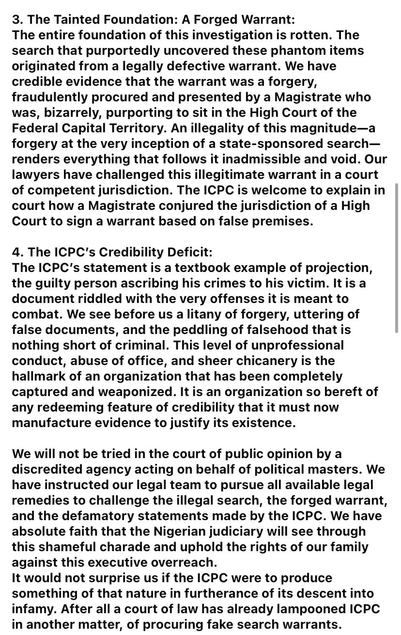 The family further questioned the legality of the search, alleging that it was conducted using a forged warrant. The statement claimed the warrant was improperly issued and disclosed that legal action had been initiated to challenge its validity in court. The ICPC was invited to address the matter before a court of law.