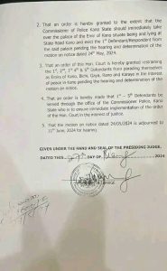“That an order is hereby granted to the extent that the Commissioner of Police Kano State should immediately take over the palace of the Emir of Kano situate being and lying at State Road Kano and evict the 1st Defendant/Respondent from the said palace pending the hearing and determination of the motion on notice dated 24th May, 2024.