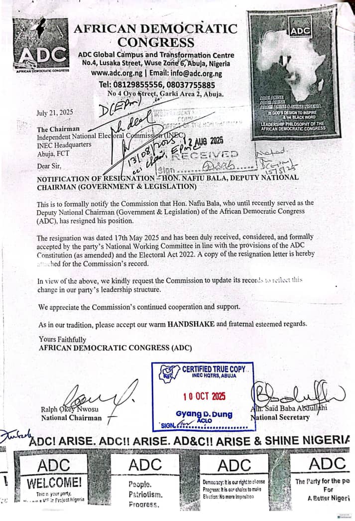 INEC, according to a document now leaked to the Internet, received notification of Hon. Nafiu Bala’s resignation. The Nafiu Bala, then Deputy National Chairman of ADC’s notification of resignation, though the person involved attempted to deny it, was duly received and stamped by INEC back then in October, 2026 thus creating the loss of public trust in the decision by the electoral body on Wednesday.