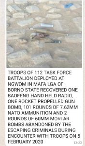 “Equally, the troops captured one General Purpose Machine Gun, one AK 47 Rifle, one Baofeng Hand Held Radio and 33 rounds of 7.62mm NATO ammunition.