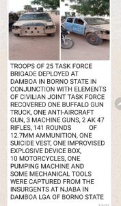 “Items recovered from the terrorists are; one Buffalo gun truck, one anti-aircraft gun, three machine guns, two AK47 rifles and 141 rounds of 12.7mm ammunition.