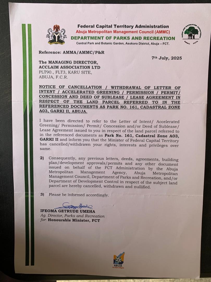 In a letter dated 17th May, 2022, and addressed to the MD/CEO, Santos Estate Limited, the author, Hajiya Riskatu Abdulazeez, the Director, Parks & Recreation Department, said, “This is with reference to your letter dated 21 February, 2022 on the above subject-matter.
