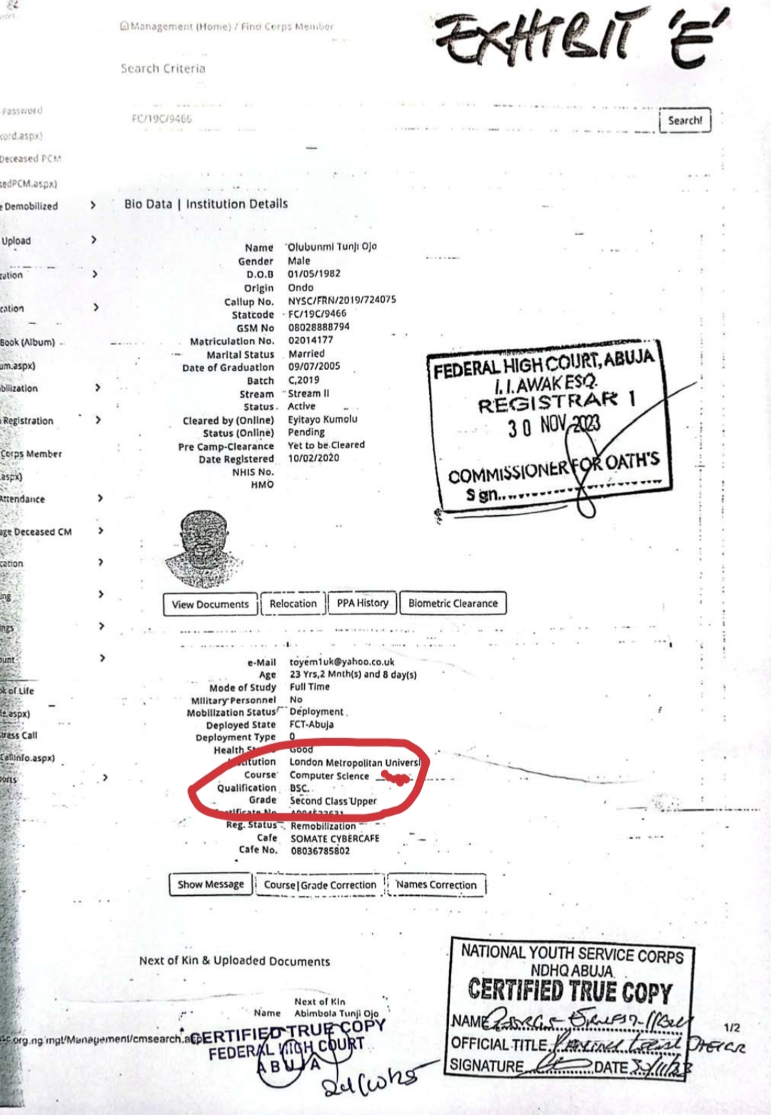 According to the leaked court documents, the Director-General of the NYSC, while testifying under oath, stated that Tunji-Ojo was mobilised for national service on the basis of a Bachelor of Science (BSc) degree in Computer Science from London Metropolitan University. This contrasts with the Bachelor of Engineering (B.Eng.) in Electronics and Communication Engineering which the minister reportedly presented to the National Assembly during his screening and confirmation.