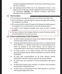 On PART 11 – Substitution Clause, the drafters proposed that the National Assembly shall invoke its inherent powers to expunge the schedule attached to decree 24 of 1999 often referred to as 1999 Constitution as amended from the decree, which “is now deemed to be an Act of the National Assembly to which the National Assembly have the powers to so do and replace same with a new governance model for Nigeria effective not later than October 1, 2024.”