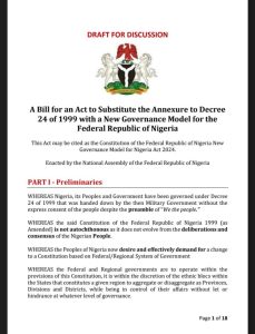 Part of the draft bill circulating on social media, seen by Our Reporter, is titled: “A Bill for an Act to Substitute the Annexure to Decree 24 of 1999 with a New Governance Model for the Federal Republic of Nigeria.”