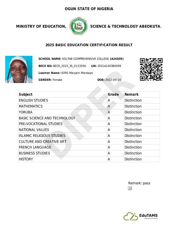 A student of Soltab Comprehensive College, Oke Ata, Abeokuta, Ogun State, Miss Maryam Idris has cleared all her eleven registered subjects in the 2025 edition of Basic Education Certificate Education (BECE) with distinctions.
