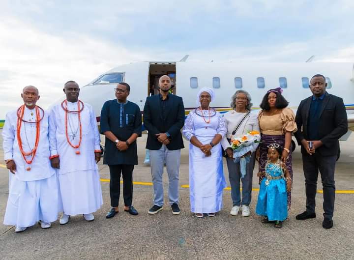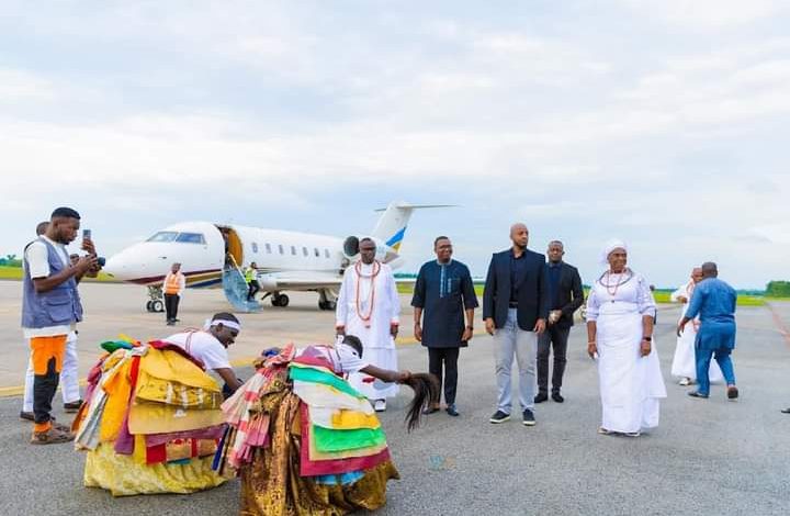 Cultural troupes entertain during aurport welcome ceremony on the arrival of King Oyo Nyimba Rukidi IV, the Omukama of Tooro, Uganda🇺🇬, Middle in Suit, as he pays visit to the OLU OF WARRI Kingdom, Ogiame Atuwatse III