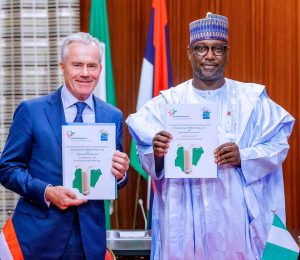 President Buhari and Prime Minister of Netherlands H.E. Mark Rutte witnessing the Signing of Communique by Nigeria’s Ambassador to the Kingdom of Netherlands, Oji Ngofa and the Deputy Head of Mission, Netherlands Embassy in Abuja, Ewout-Jan de Wit as he receives in audience Prime Minister of Kingdom of Netherlands in State House on 26th Nov 2019.