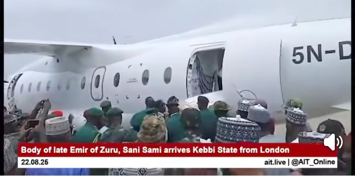 The remains of the late Emir arrived at Zuru airstrip morning of Friday August 21, 2025 aboard aircraft 5N-DOY, alongside Idris, members of the Emir’s family and other sympathisers.