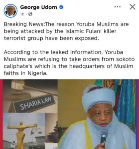 George Udom, an identified ruling All Progressives Congress (APC) members, posted among others a falsehood quoting and attributing to the Sultan statement he did not make and making same statement going viral on the social media.