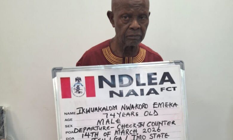 The septuagenarian, who claimed he was travelling to London, United Kingdom for vacation, was arrested by NDLEA officers at the departure hall of the Abuja airport while attempting to board a British Airways flight BA082 to Heathrow London, on Saturday 14th March 2026.