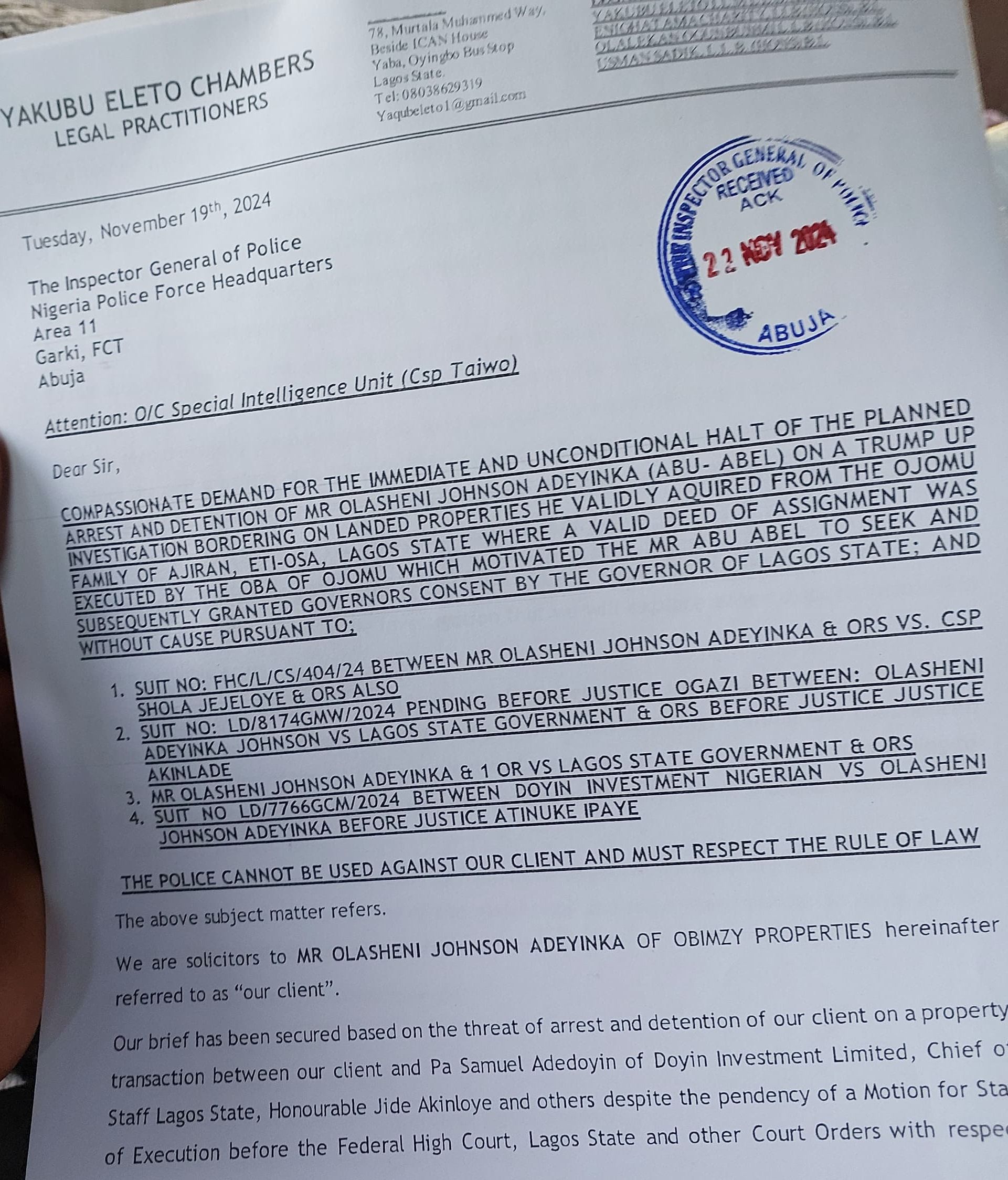 The letter with a subject matter, “The police cannot be used against our client and must respect the rule of law”, read: “We are solicitors to MR. OLASHENI JOHNSON ADEYINKA OF OBIMZY PROPERTIES hereinafter referred to as “our client”.